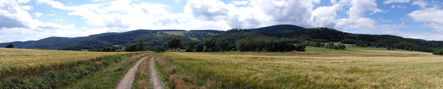Skręcamy tu i przechodzimy obok kilku zabudowań, by następnie wejść na polną ścieżkę. Wśród pachnących łąk i wspaniałych widoków na Szczepanowski Grzbiet i Góry Krucze, a po czeskiej stronie Vraní horydo. Dochodzimy do granicy lasu. Zdobywamy Pańską Górę (756 m), gdzie krzaki malin nie pozwalają nam tak obojętnie obok siebie przejść.