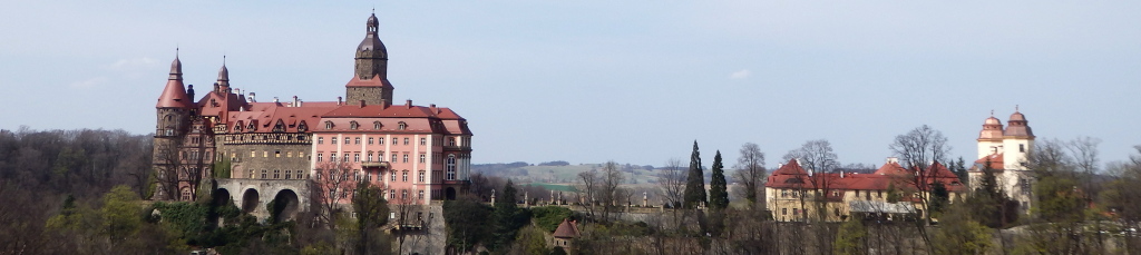 Po drugiej stronie rzeki również na wysokim cyplu skalnym w zakolu rzeki Pełcznica stoi monumentalny zamek Książ, gdzie ludzi jak mrówek.