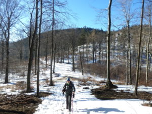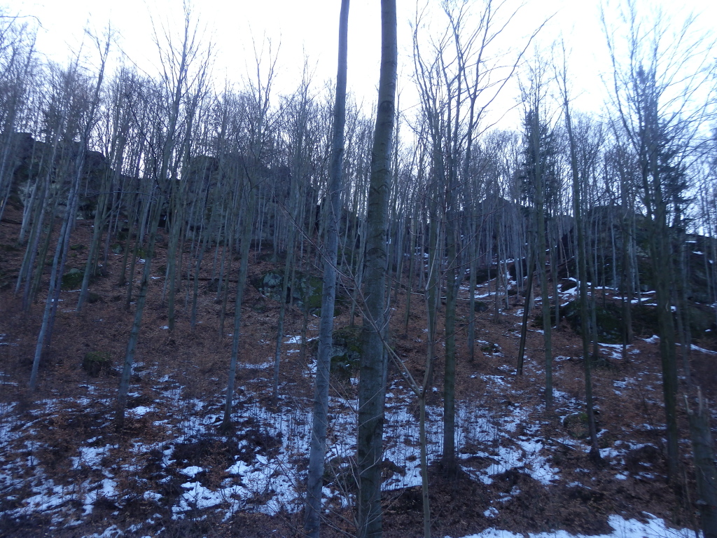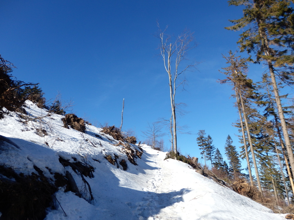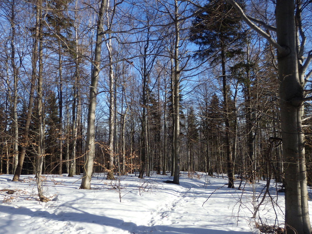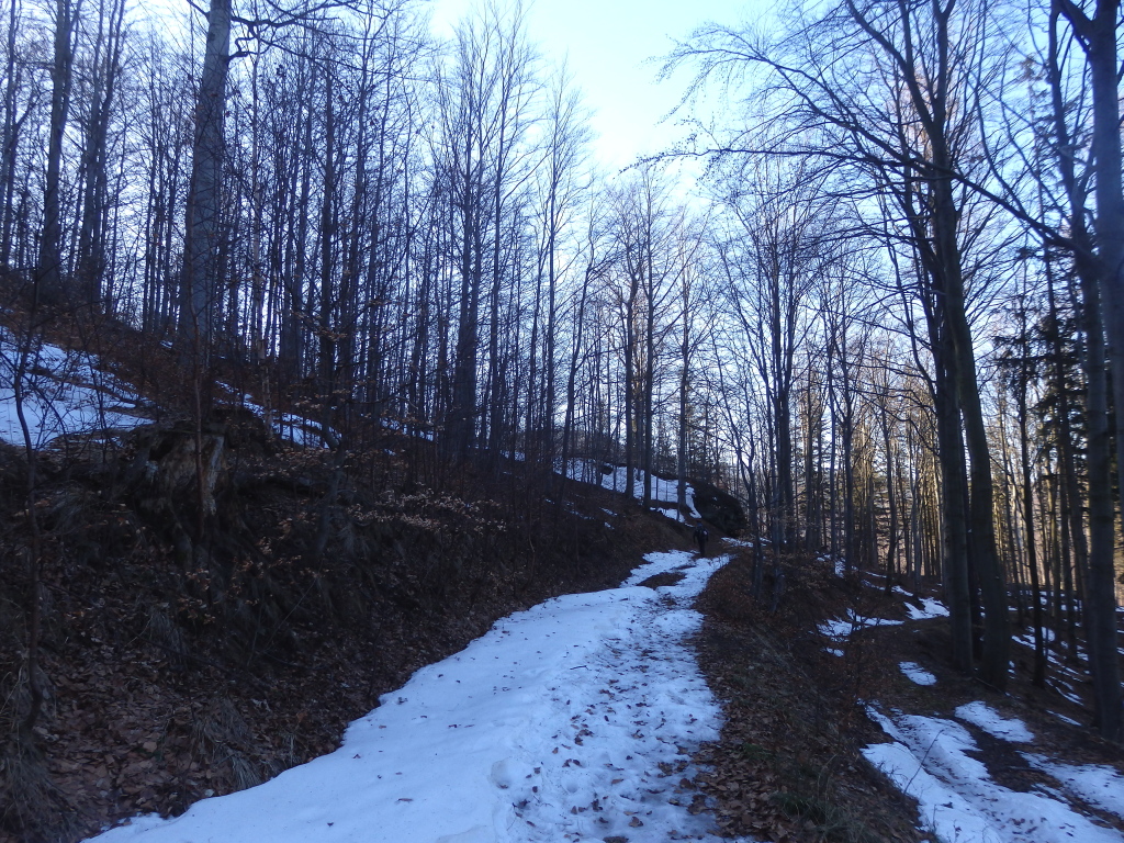 Na początku śniegu nie było, ale im dalej w las to zaczął pojawiać się biały puch. Raz więcej, raz mniej, tak będzie nam towarzyszył na sam szczyt.