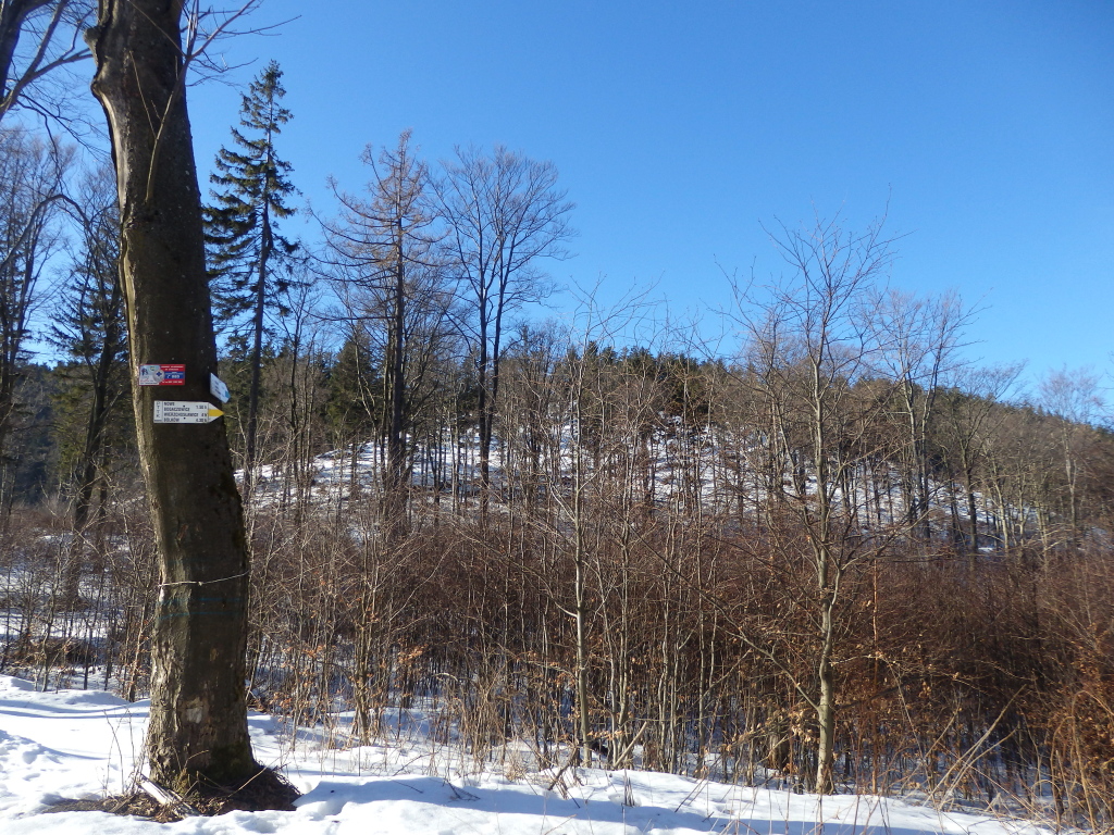 Szlak wije się delikatnie podchodząc i schodząc, mijamy wychodnie skalne i dochodzimy do rozdroża Siedem Dróg.