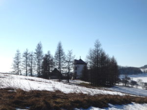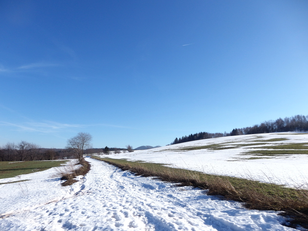 Po chwili żegnamy się z miłą Panią i podążamy dalej. Po opuszczeniu lasu mamy przed sobą biało zielony krajobraz.