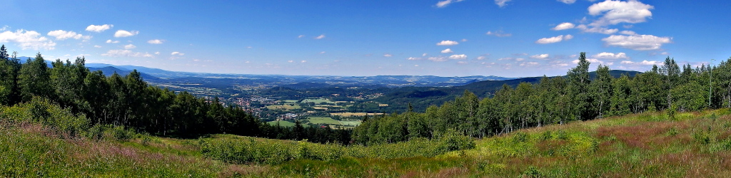 które prowadzą w okolice szczyt (biegną w kierunku Bobrzaka) Szlak już na samym początku oferuje panoramę na majaczące w oddali Góry Kamienne i Wałbrzyskie.